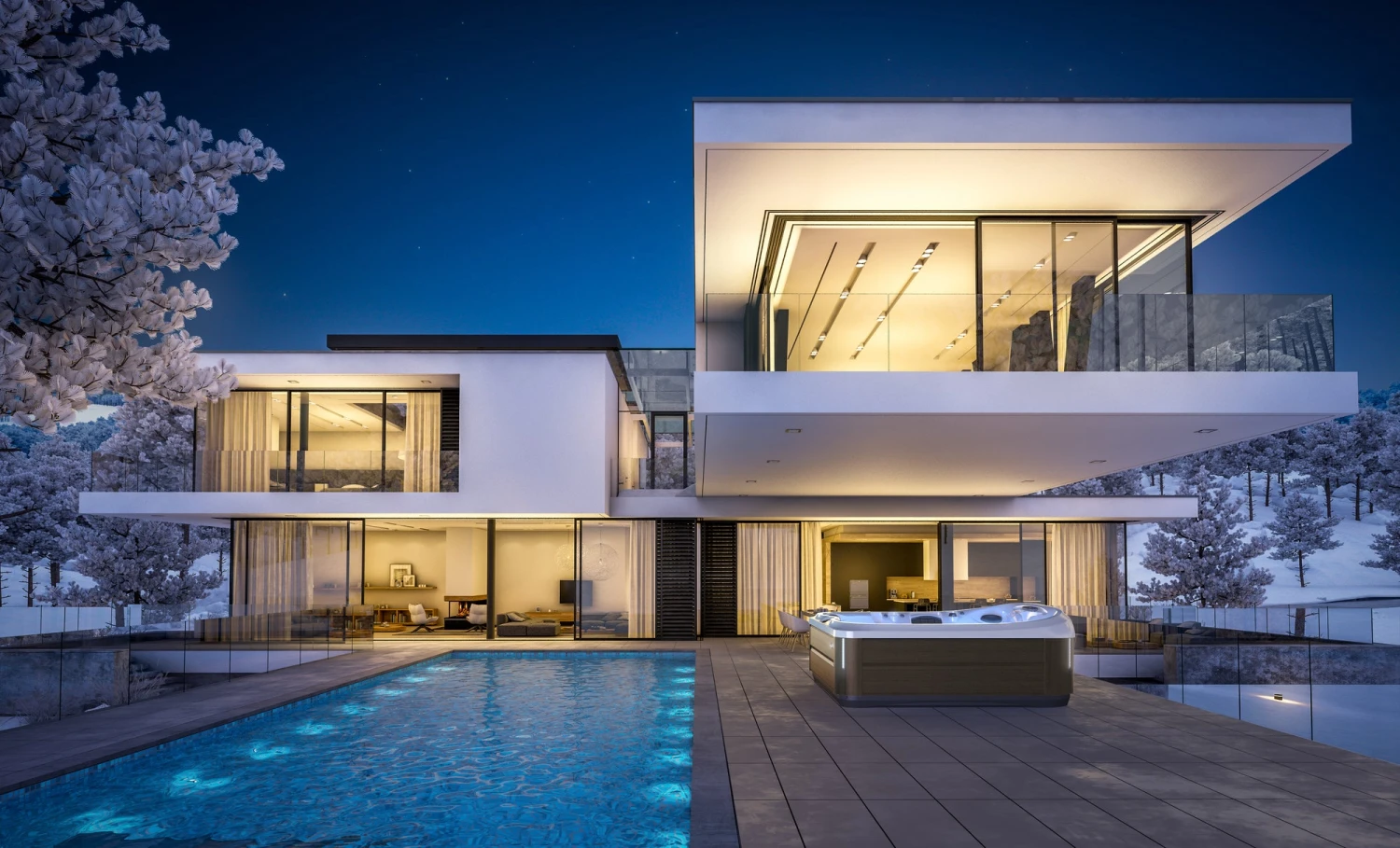 - Illuminated waterfall and interior and exterior lights