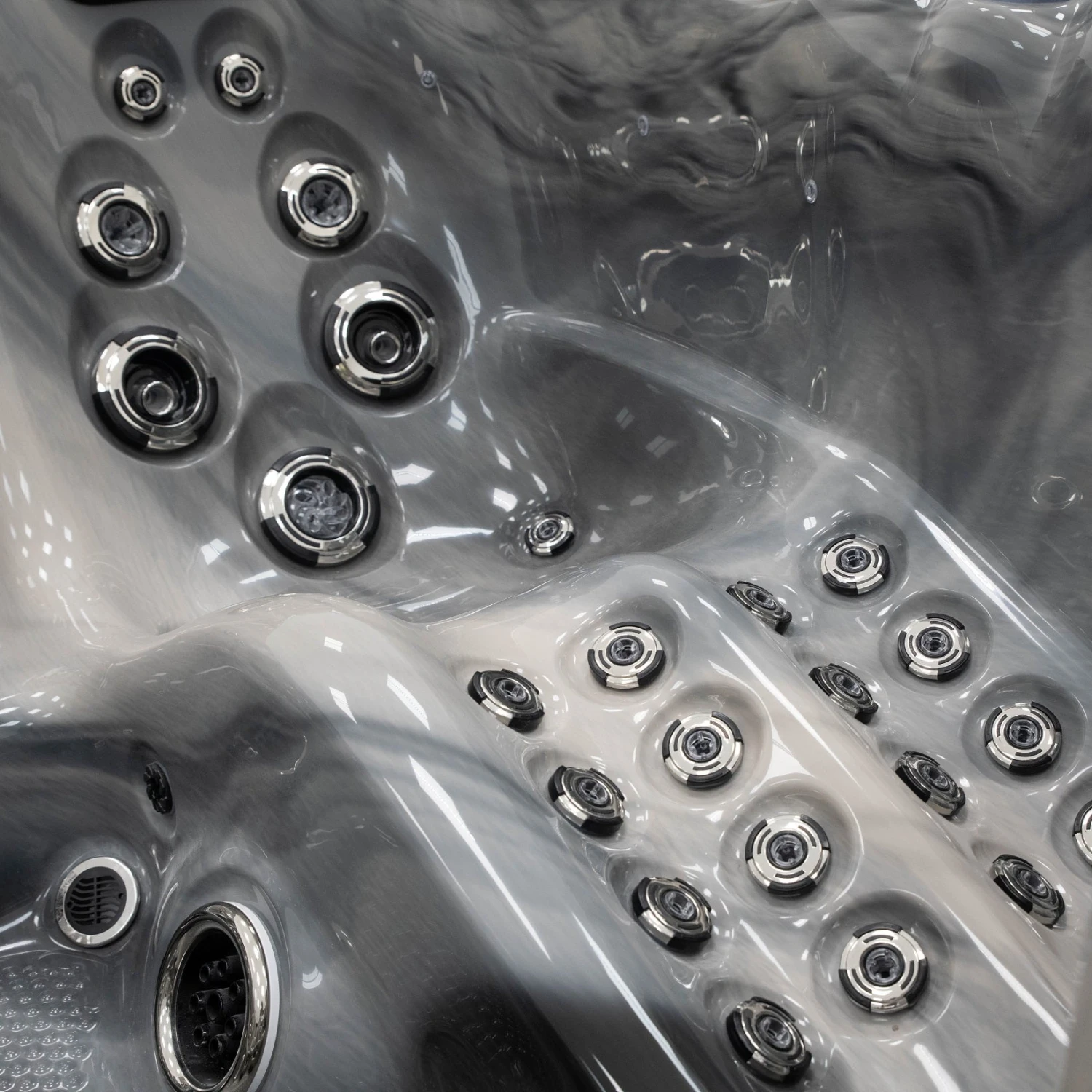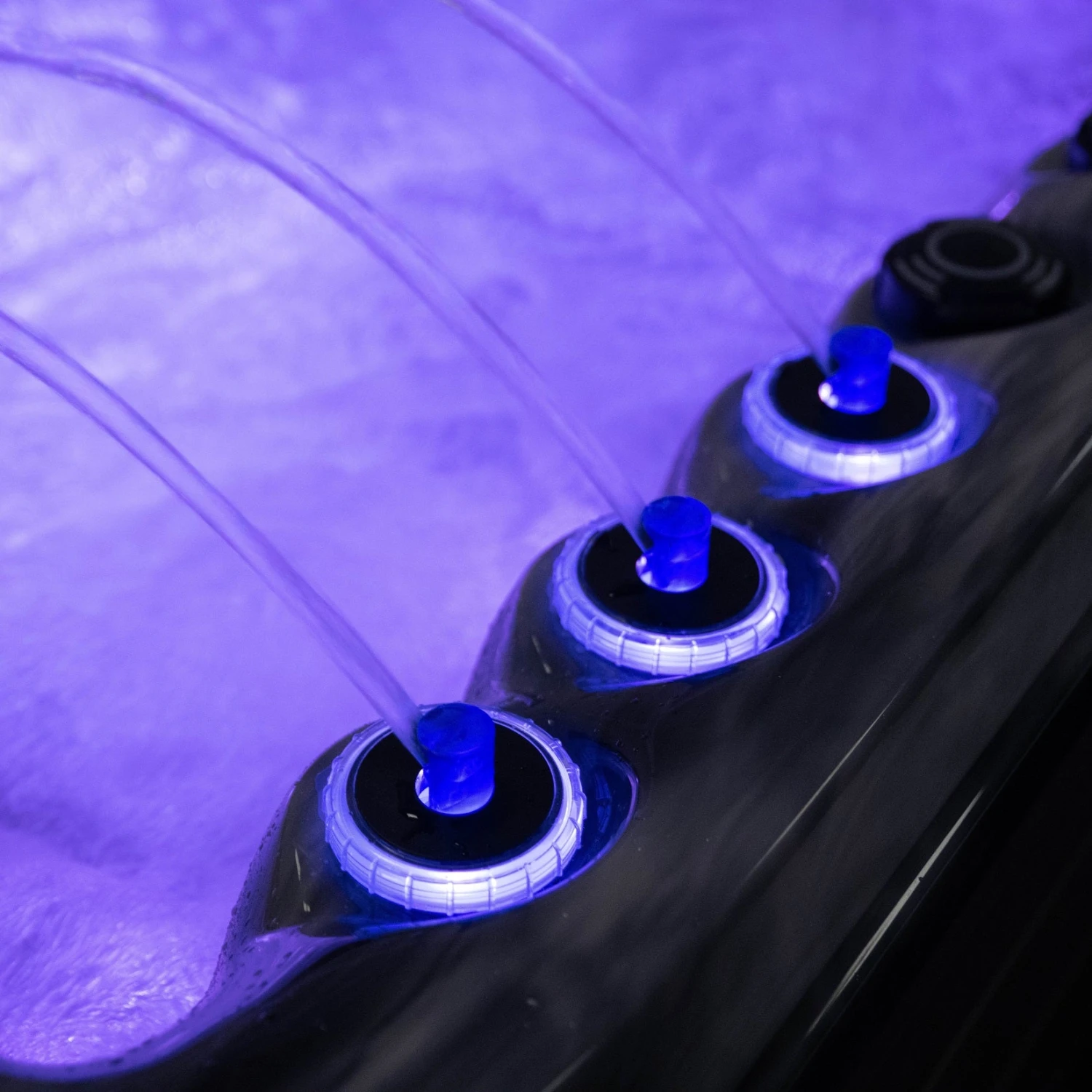 49 rotating and directional jets have been placed in a specific formation for various muscle groups in each seat so you can focus on key areas to suit your needs. Thereās even a selection of diverters placed around your hot tub to give you complete control of pressure and jet selection using the control panel. The LED-backlit water fountain adds to your well-being journey.